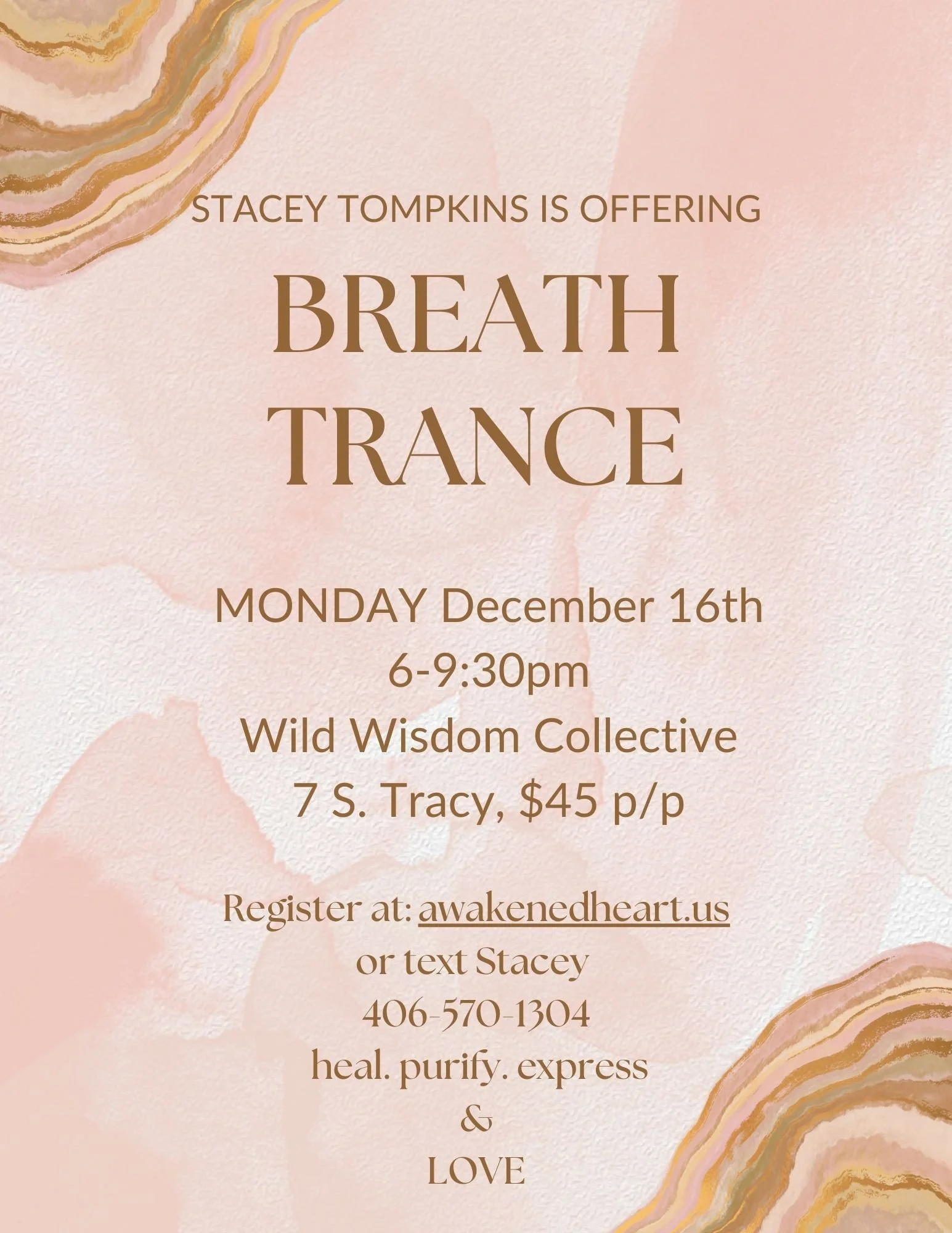 Breath Trance Monday, December 16, 2024 6:00 PM 9:30 PM Wild Wisdom Collective 7 South Tracy Avenue Bozeman, MT, 59715 United States (map) Google Calendar ICS