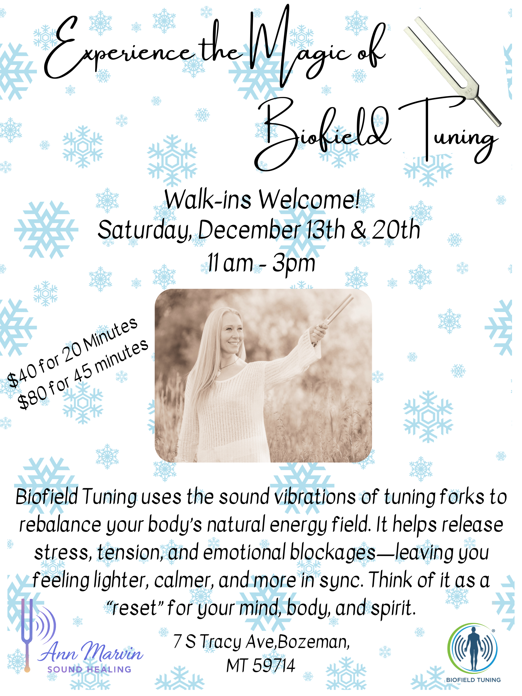 Back to All Events Biofield Tuning Saturday, December 13, 2025 11:00 AM 3:00 PM Wild Wisdom Collective 7 South Tracy Avenue Bozeman, MT, 59715 United States (map) Google Calendar ICS