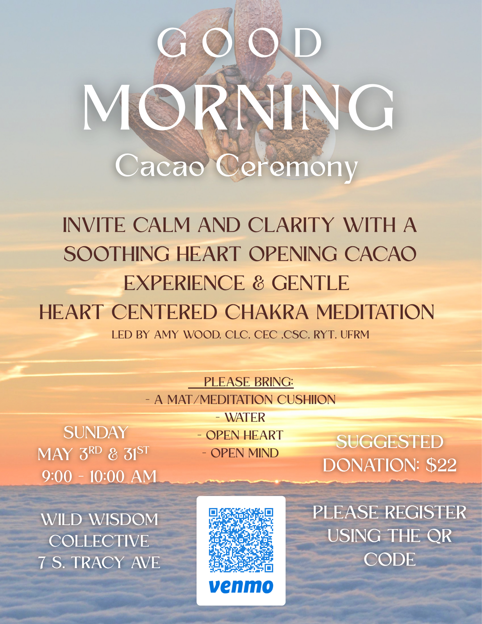 Good Morning Cacao Ceremony Sunday, May 31, 2026 9:00 AM 10:00 AM Wild Wisdom Collective 7 South Tracy Avenue Bozeman, MT, 59715 United States (map) Google Calendar ICS