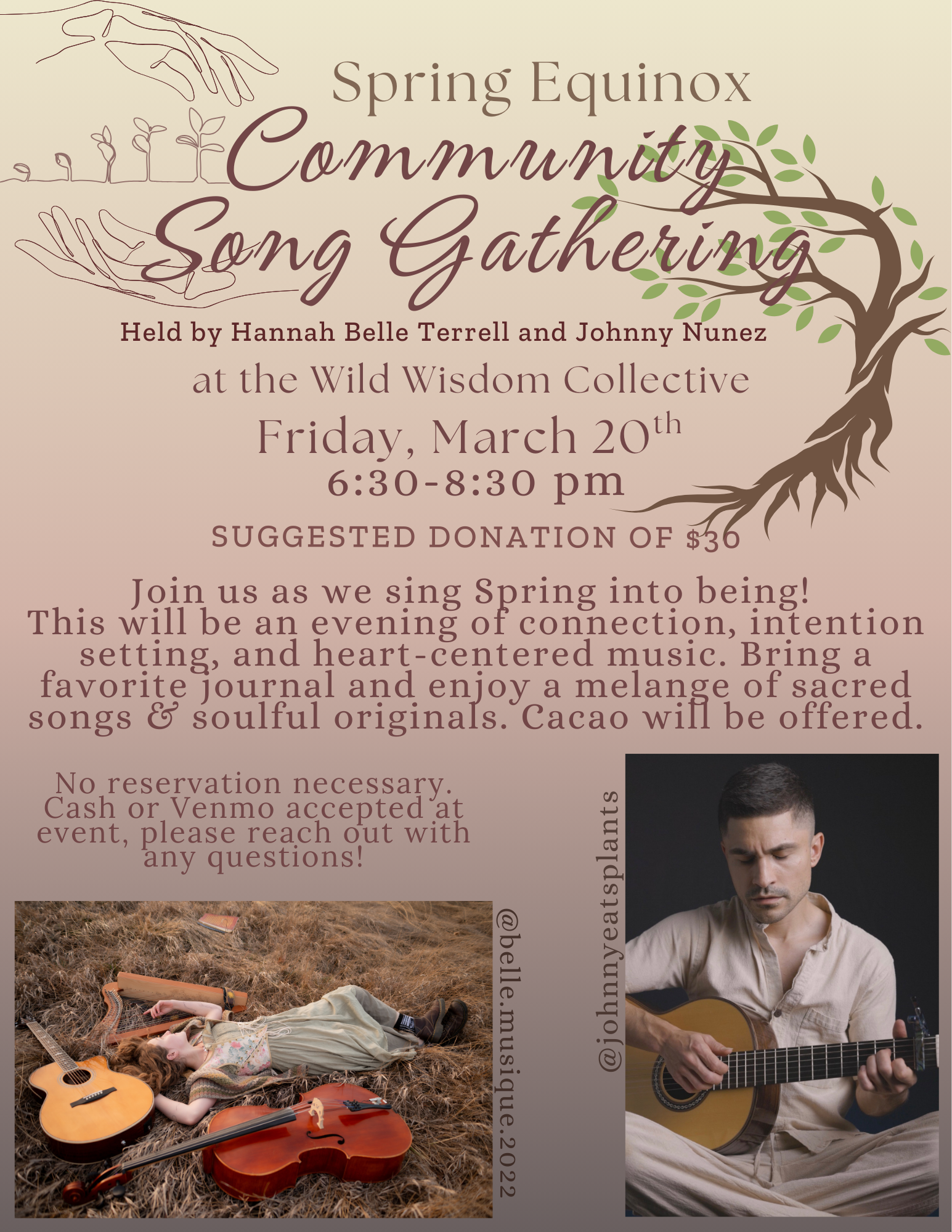 Back to All Events Community Song Gathering Friday, March 20, 2026 6:30 PM 8:30 PM Wild Wisdom Collective 7 South Tracy Avenue Bozeman, MT, 59715 United States (map) Google Calendar ICS